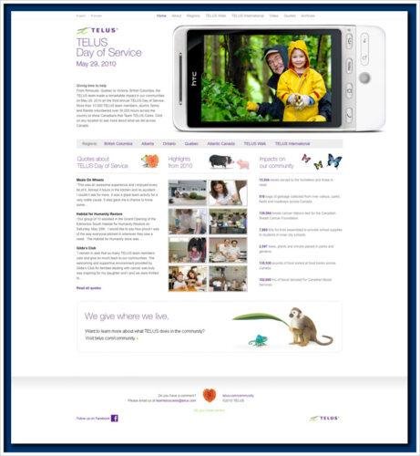 A website to showcase the amazing efforts of over 30,000 TELUS employees who volunteered on May 29, 2010 to charitable organizations across Canada. Site designed in Wordpress.